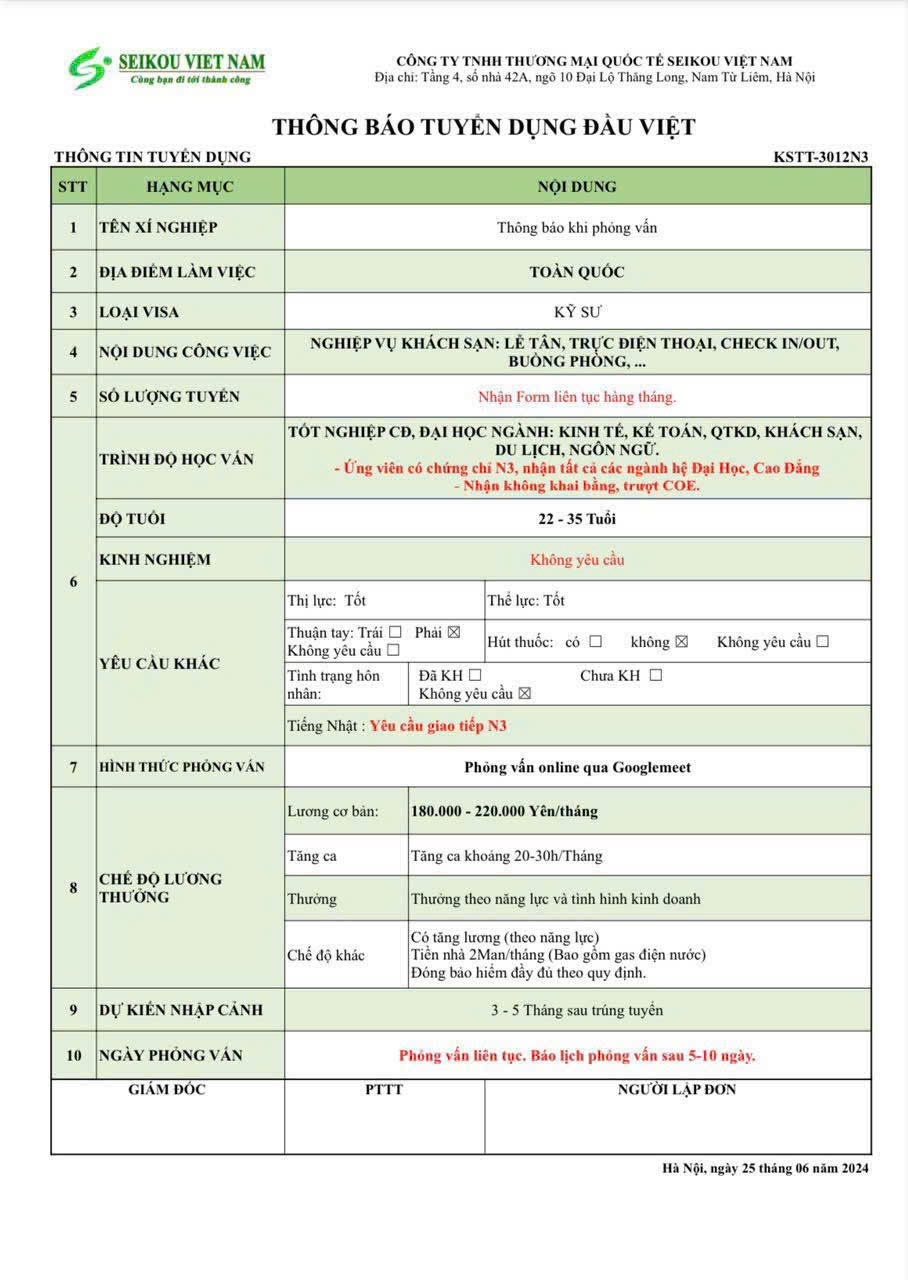 Thông báo tuyển Kỹ sư Khách sạn truyền thống N3